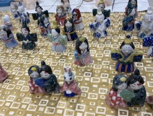今回は、市内の作家「亀井桂子」氏が製作したお雛様を最上段に展示します。